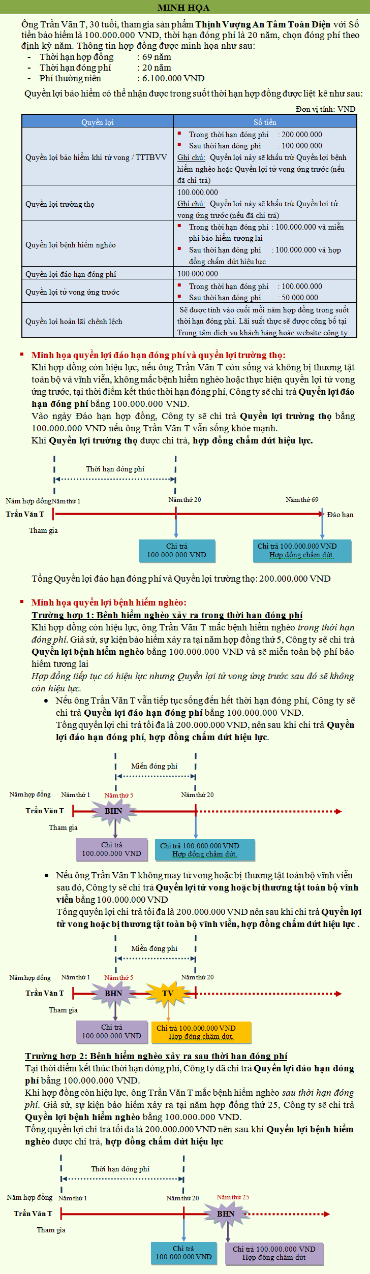 Nếu Người được bảo hiểm mắc một trong mười lăm bệnh hiểm nghèo nói trên, Công ty sẽ chi trả 100% Số tiền bảo hiểm để điều trị bệnh. Đồng thời, Hợp Đồng tiếp tục có hiệu lực và Công ty sẽ miễn phí bảo hiểm trong tương lai cho Hợp Đồng (không bao gồm Phí bảo hiểm của sản phẩm bổ sung); tuy nhiên Phí bảo hiểm đã đóng sẽ không được hoàn lại.