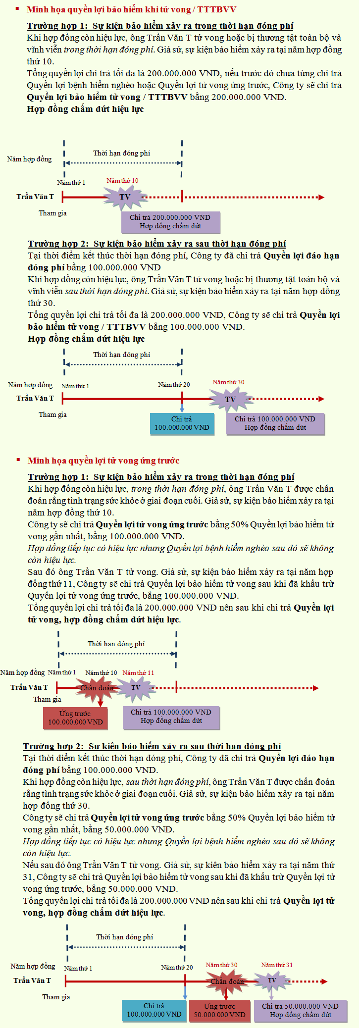 Công ty chi trả 200% Số tiền bảo hiểm nếu sự kiện xảy ra trong thời gian đóng phí hoặc 100% Số tiền bảo hiểm nếu sự kiện xảy ra sau thời gian đóng phí. Quyền lợi Bệnh hiểm nghèo và Quyền lợi tử vong ứng trước (nếu đã được chi trả) sẽ được khấu trừ trước khi chi trả quyền lợi này.